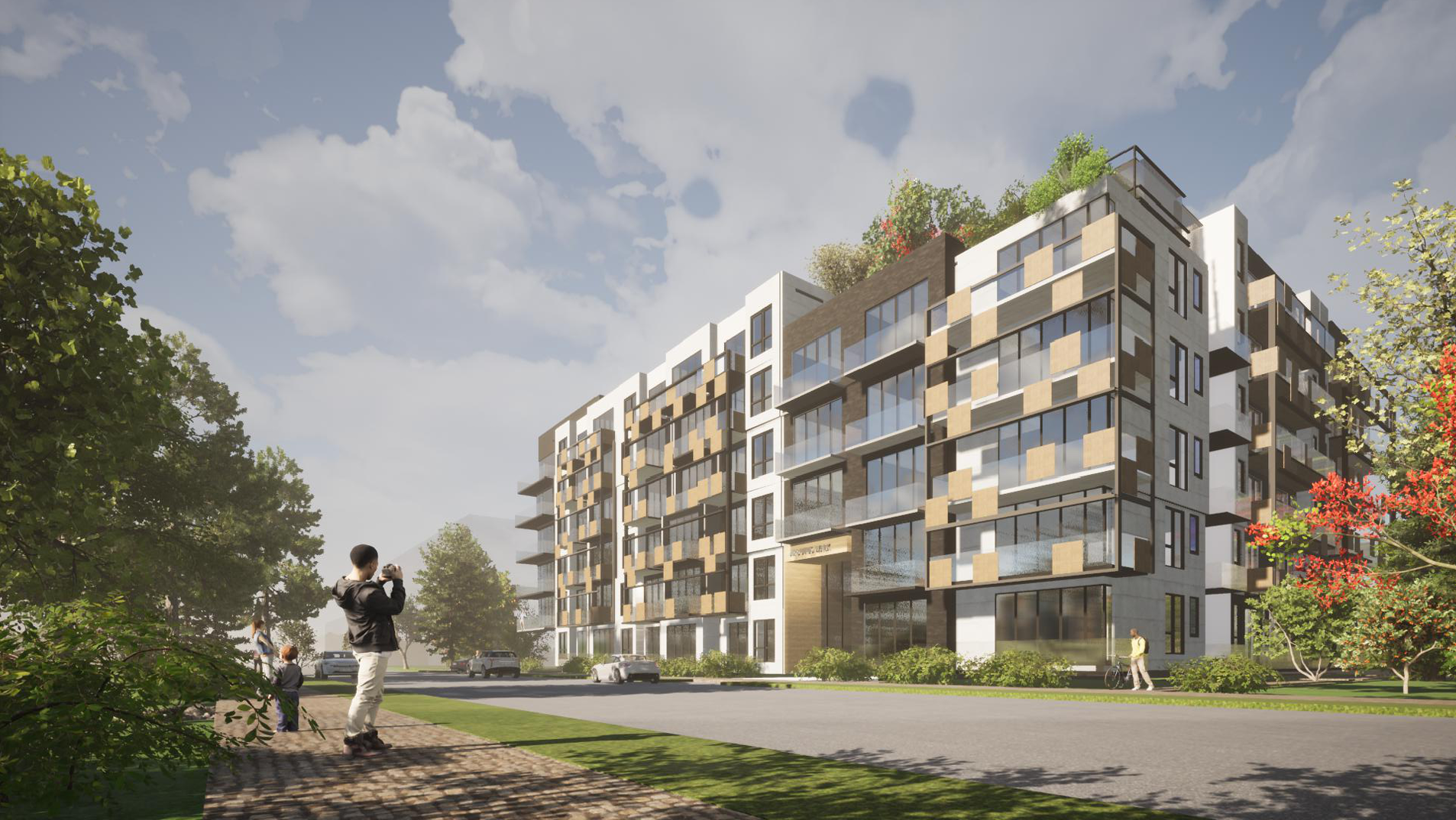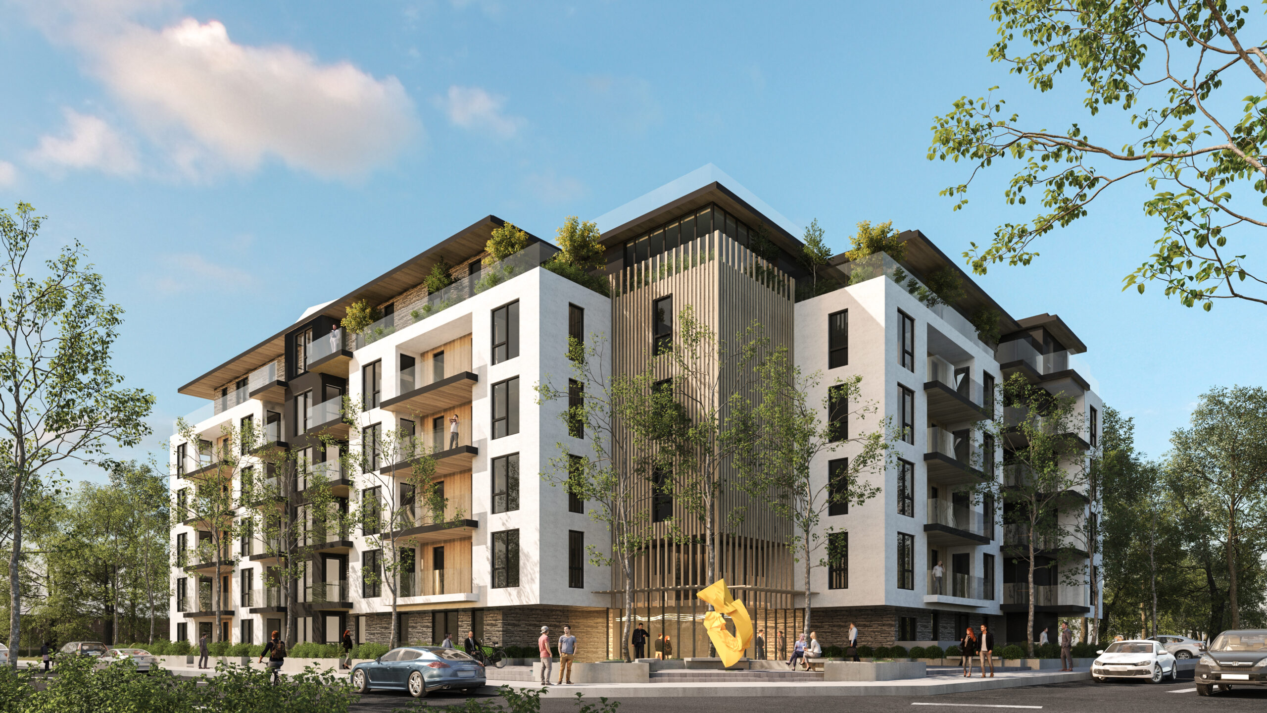 The small material palette consists of natural earth-tones, and include stone, wood and high-quality white/grey composite cladding. The wood is used as a warm accent material on the soffits, plaza-element and within the recessed balconies. The materials both compliment and contrast with each other, promoting harmony and connecting the building to its context.